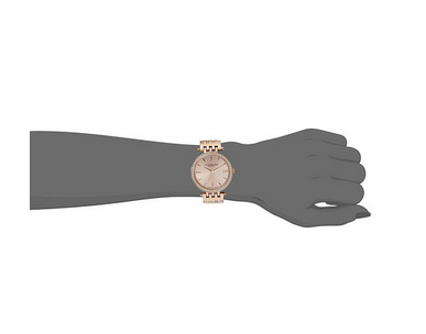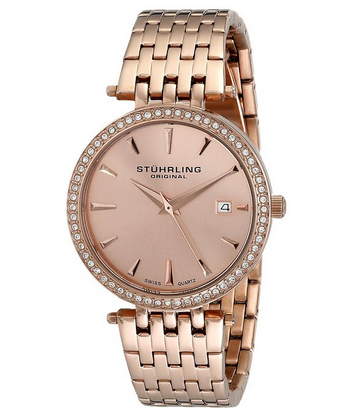 此款Stuhrling 斯图灵Original 579.04 Soiree 女士手表,抛光rose-tone不锈钢手镯和边框与施华洛世奇水晶口音,保护Krysterna水晶拨号窗口,Rose-tone表盘与日期和gold-tone标记,16 k玫瑰金分层七行链接和按钮扣手镯,防水165英尺,适合游泳和洗澡。(海淘教程)