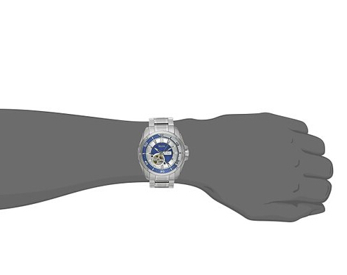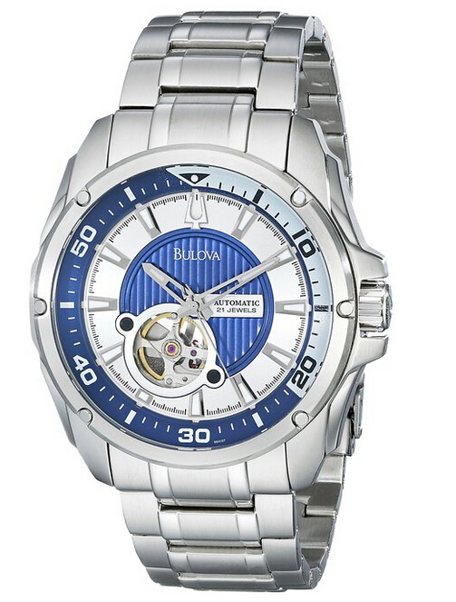 此款型号为96A137的男款腕表,采用自动机械机芯打造,深蓝和银色相互交错表盘层次感分明,抛光和拉丝工艺更显质感。21石机芯、背透设计、镂空窗口等都颇为精致,46mm表径,厚度14mm,防水100米。