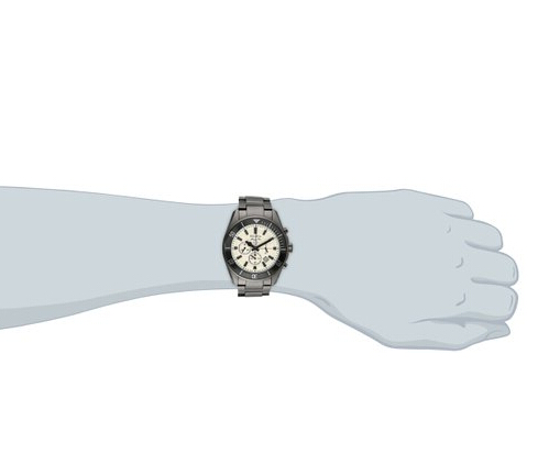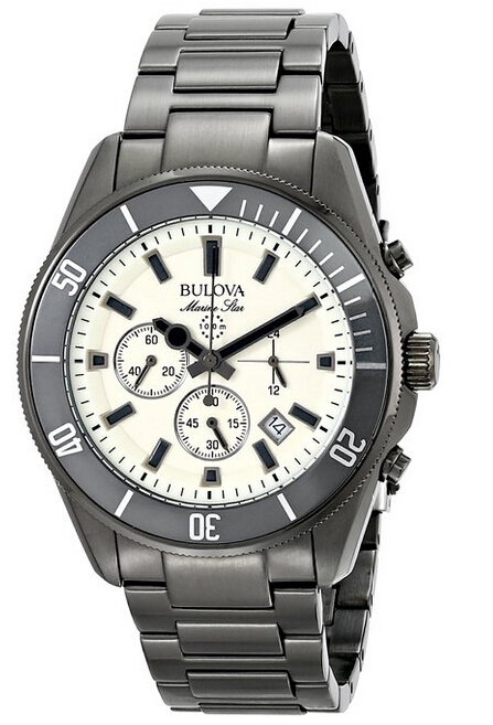 这款Marine Star系列石英男表98B205 ,采用日本石英机芯,奶油色表盘,三个计时小表盘,分别显示12小时、30分钟和小秒针,矿物水晶镜面,银灰色不锈钢抛光表壳和表链,单向旋转表圈,表径44毫米,厚12毫米,100米防水。