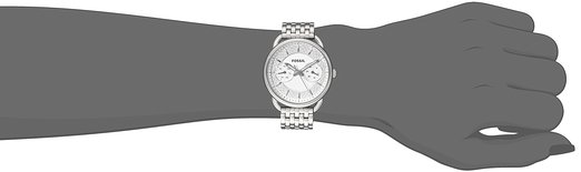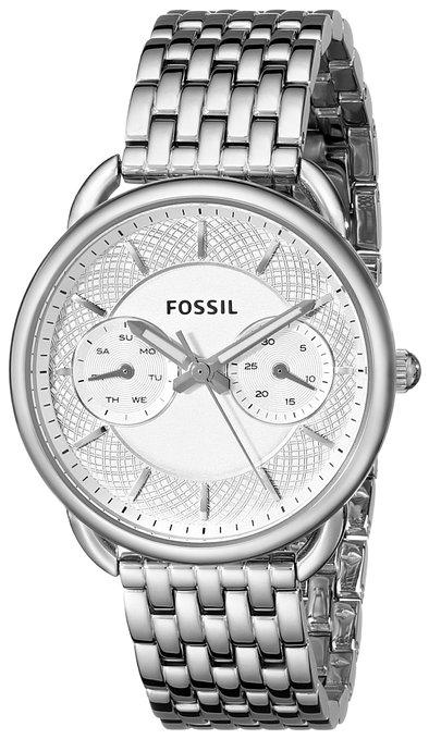 这款Fossil Tailor Multifunction 化石女士时尚石英手表 ,内置精确石英机芯,外观采用银色不锈钢表壳表链设计,端庄典雅,气质非凡,防刮耐磨矿物玻璃表镜下为银色纹理表盘,表盘上镶有银色刻度,表盘带有日历星期副表盘,夜光指针方便夜间读取,表盘直径35mm,防水深度50m。