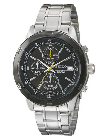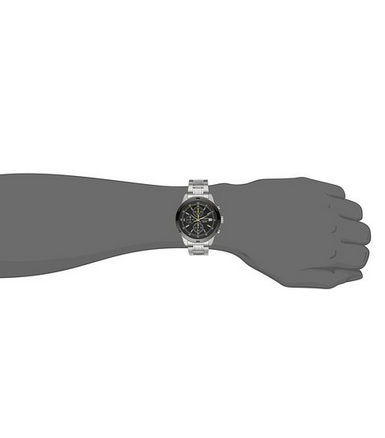 这款男表采用日本产石英机芯,采用黑色不锈钢表壳和银色表带,3点钟日期显示,0.1秒,60秒和60分计时功能。三眼表盘,时针、分针和刻度为银色,小秒针和1/10计时针为稍显跳跃的黄色。表盘直径44mm,厚度11mm,日常防水100米。