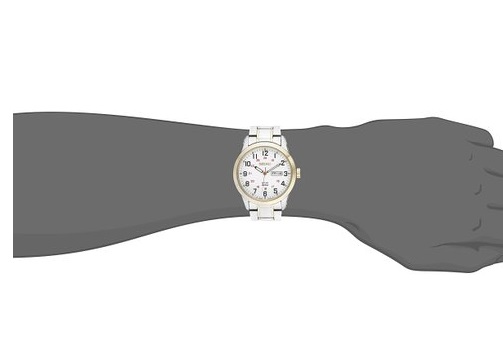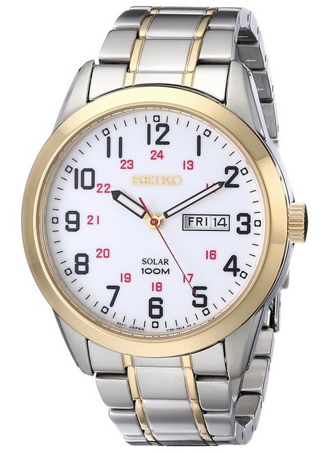 精工 Seiko 男士SNE370 石英双色防水手表,采用日本制造的石英机芯,43mm表径,银色精钢表带,金色精钢表盘,白色表盘,数字刻度作了艺术处理,3点处有日期显示功能,100米防水,外形比较年轻时尚。
