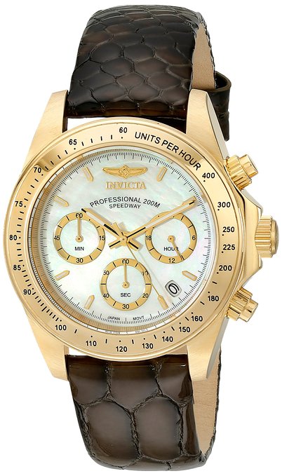 这款Invicta 18366 Speedway 别克展望女士计时石英手表 ,内置精确日本石英机芯,外观采用褐色真皮表带搭配金色不锈钢表壳设计,防刮耐磨矿物玻璃表镜下为白色珍珠母贝表盘,表盘上镶有金色刻度,4-5点钟之间为日历显示窗,三眼计时副表盘,夜光指针方便夜间读取,表盘直径39mm,防水深度200m。