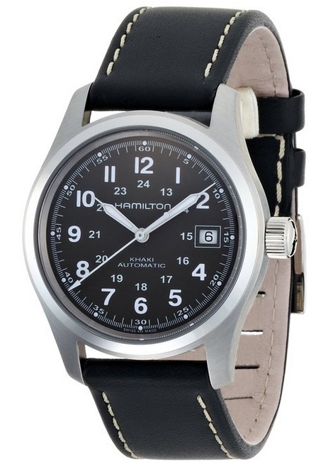 汉密尔顿Hamilton H70455863 Khaki Field Automatic Watch卡其野战系列机械男表由瑞士制造,25钻瑞士制造ETA2824-2自动上链机芯。38mm黑色表盘,厚11mm,夜光指针和阿拉伯数字小时刻度。防刮蓝宝石水晶镜面,不锈钢表壳,黑色真皮表带。100米防水。