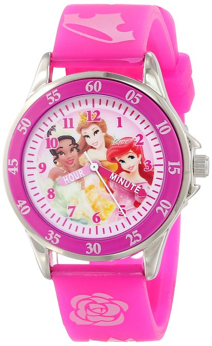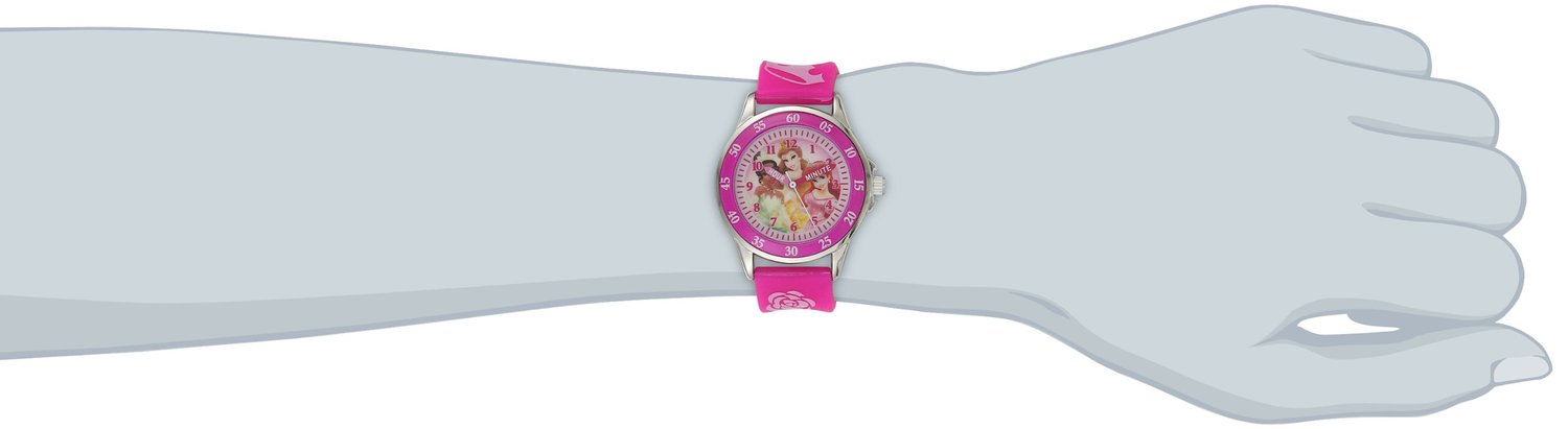 这款正版 Disney 迪斯尼 PN1051公主系列儿童手表,以迪斯尼公主为主题,表盘直径33mm.,厚度为6mm,矿物玻璃表镜搭配粉色表带,表带上印有玫瑰花,王冠等图案,表盘上有三位美丽的迪斯尼公主,时针和分针指针都有英文显示,在引领时尚之余,还能帮助小朋友学到知识,一举两得。整体设计,可爱大方,是小女孩的心头之爱。