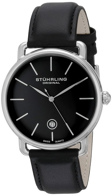 这款斯图灵Stuhrling Original经典男士手表内置优质瑞士石英机芯,保证了时间的精确,外观采用黑色真皮表带搭配银色不锈钢表壳设计,经典优雅,气质非凡,防刮耐磨矿物玻璃表镜下为黑色表盘,表盘上镶有银色条形全时刻度,6点钟方向为日历显示窗,银色时分秒指针简约干净,表盘直径42mm,防水深度50m。