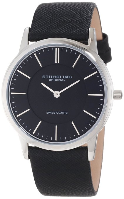这款Stuhrling Original 男士经典石英手表内置优质瑞士石英机芯,保证了时间的精确,外观采用黑色皮质表带搭配银色不锈钢表壳设计,经典优雅,气质非凡,防刮耐磨矿物玻璃表镜下为黑色表盘,表盘上镶有银色全时刻度,边缘精确到秒,银色时分指针简约干净,表盘直径37mm,防水深度50m。