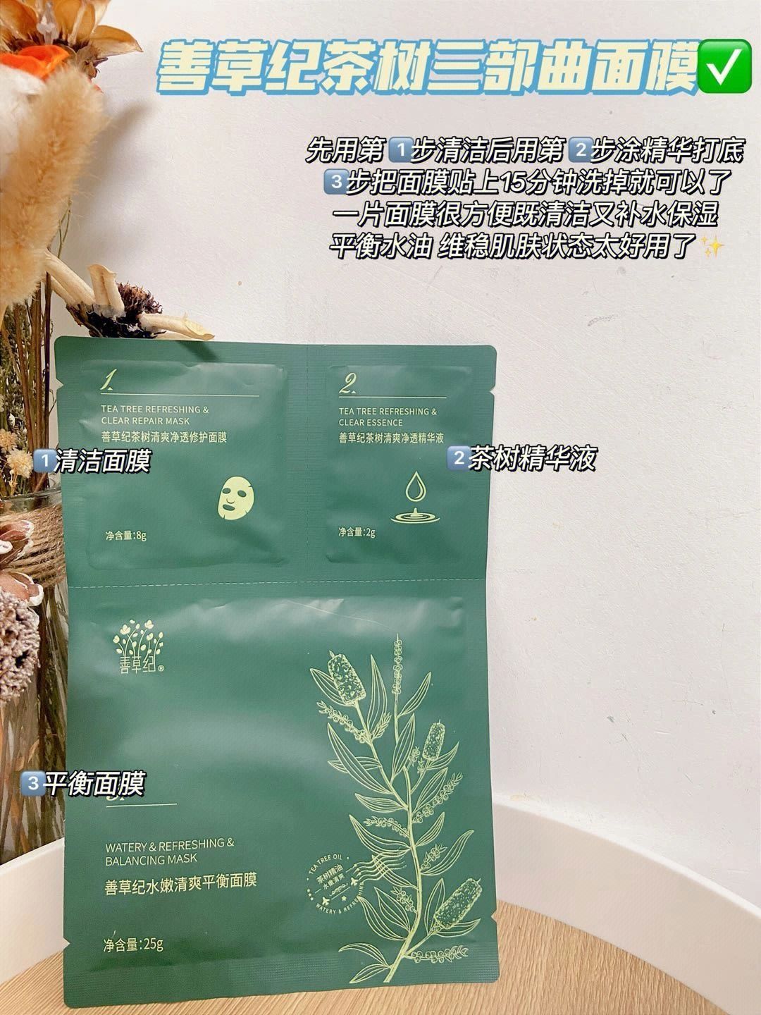 善草纪茶树三部曲 这款面膜是一款把清洁集补水为一体的面膜 先用第️步清洁在用第️步涂茶水精华油打底第️步敷上面膜15分钟左右洗掉就可以了 很方便一片面膜既可以清洁又可以补水 价格也很️