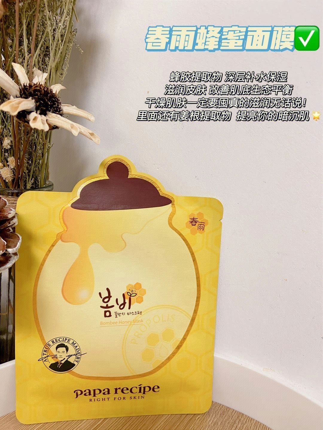 春雨蜂蜜面膜 一款火了很久的面膜 我上学时期就有 里面含有蜂胶提取物 可以滋润皮肤 改善基地的生态平衡 里面还含有姜根提取物 可以提亮暗沉肌 皮肤干的可冲