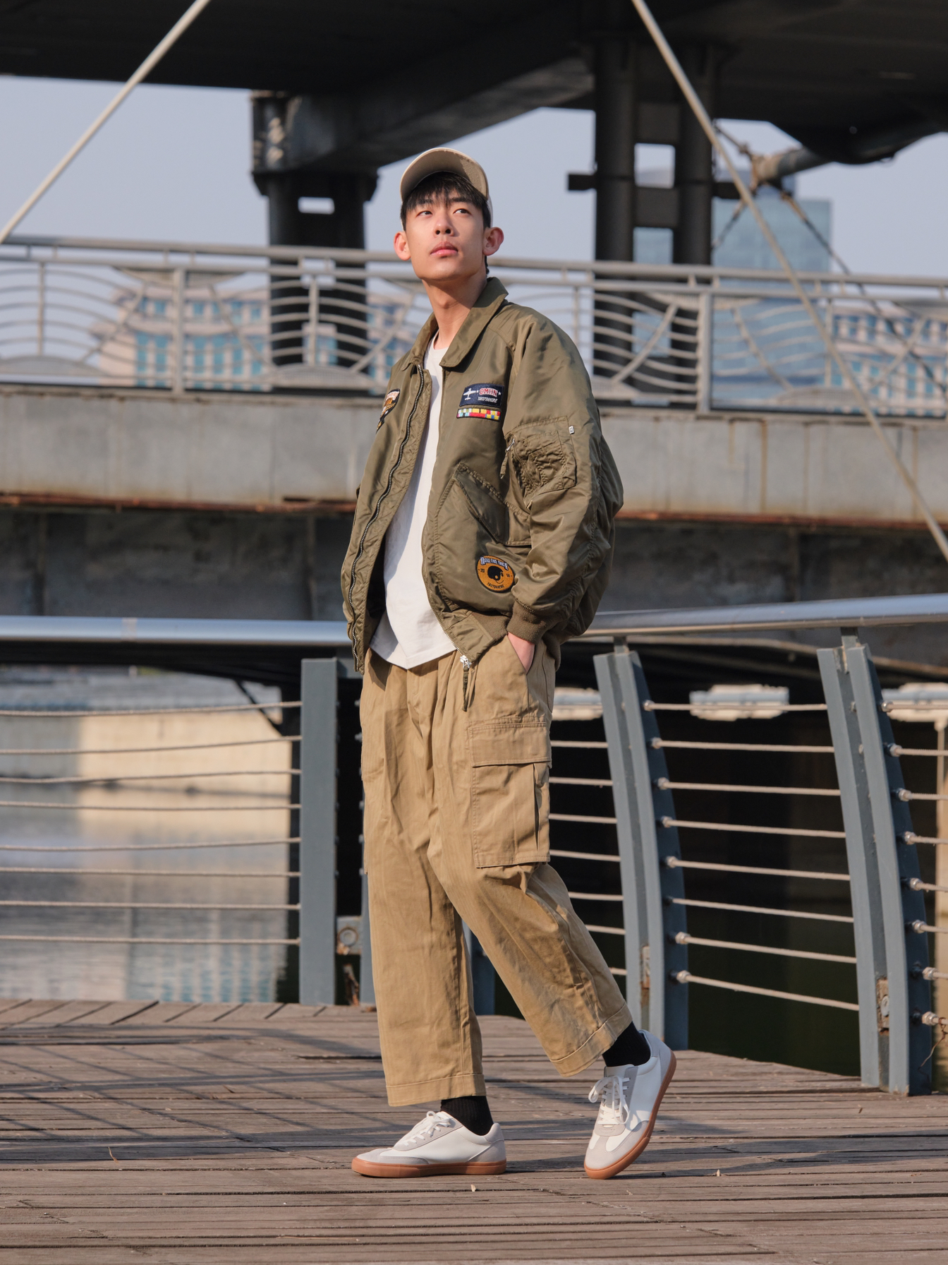 上半身选择一件军绿色的MA1夹克,内搭白色T恤,简约不失帅气与硬朗气息,而且刺绣拼贴点缀不会显得过于沉闷。下半身则是浅卡其色的工装长裤,与上半身很协调,而且都是宽松的版型工装风格轻松驾驭。
