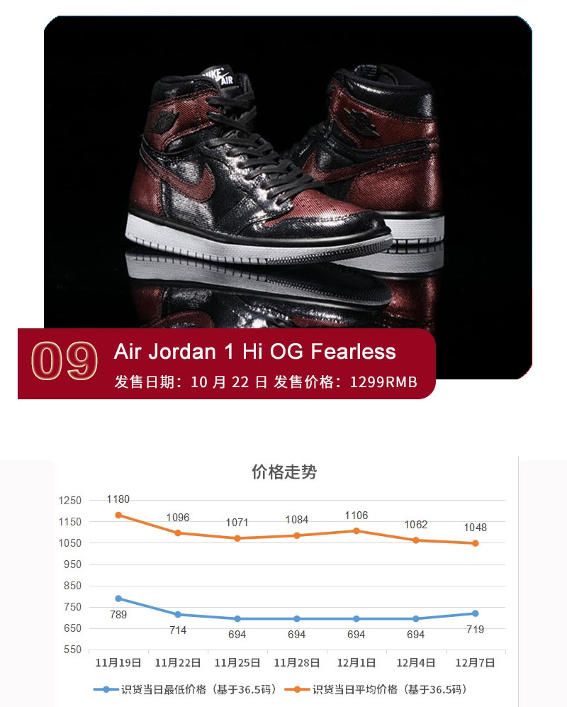 在发售一个多星期后,鞋款的最低价格就跌破千元,半个多月的时间内最低价格也继续向下,虽然最低价格有一些回升的迹象,但平均价格方面依旧表现为下降走势。目前鞋款价格比很多中低帮配色还要低,考虑到近期系列的热度以及平均价格已是近期最低,所以想入手AJ1的女性朋友不妨考虑一下这双鞋。
