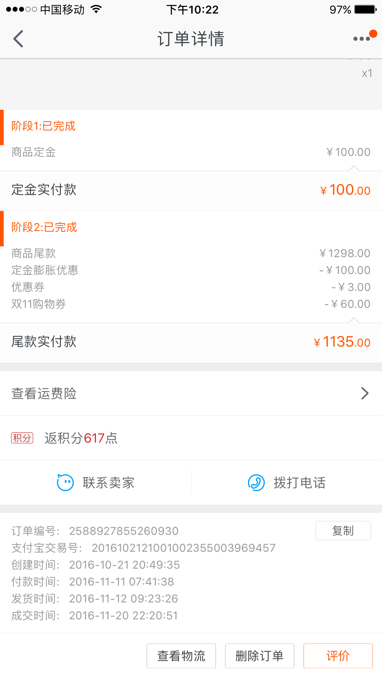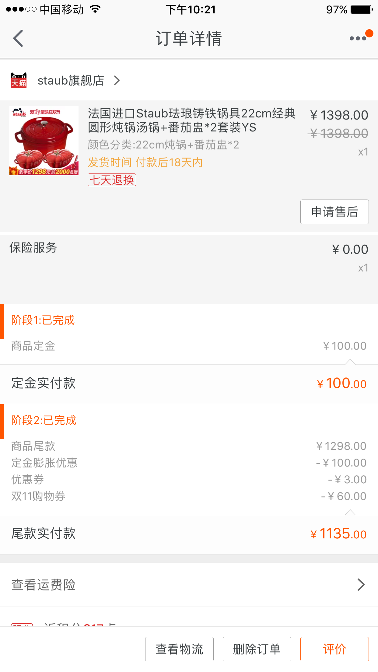 其实在双十一之前,我们想买珐琅锅,品牌只锁定在STAUB和LC,做了一番功课,知道这两个都是世界顶级的牌子,没有什么实质区别,只不过从外形上看,STAUB的线条硬朗,LC则偏柔美。于是就看价格来说话。看双十一的活动,STAUB的单品价格比LC诱人很多,套装的价格就更加给力了,一个22cm的外加两个?炖盅,才¥1,398,然后我们通过预付定金和双十一优惠券,最后成交价为1,235。以下我们的订单信息,提前快一个月预付了定金,心里那个期待啊!