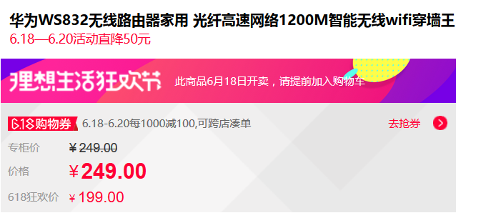 四根高性能天线,大功率信号放大器,智能天线算法,超强覆盖!此款HUAWEI 华为 WS832 双频无线路由器,目前天猫商城618