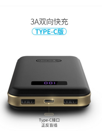 ORICO type-c双向快充手机电脑笔记本充电宝12500mAh显屛移动电源,全黑的机身,表面看似磨砂设计,有种防滑的作用。顶部是一块用来显示电量百分比的液晶屏幕,底部是品牌LOGO。按动机身右侧的按键可以实时显示电源电量,并且数秒后会自动熄灭。从侧面来看,机身左侧是micro USB输入口,从侧面也可以看到机身除了低调的黑色还有侧面的金色做陪衬,个人感觉比较适合男人使用。增加了一个Type-C双向接口,作为输入口使用,3A明显比2A的充电速度快不少。而对于输出功能,有相关设备的小伙伴可以体验一下效果。