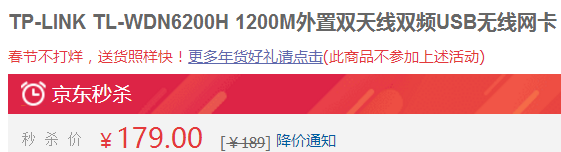 优惠精选 冰点价!普联TL-WDN6200H 无线网卡 179元包邮