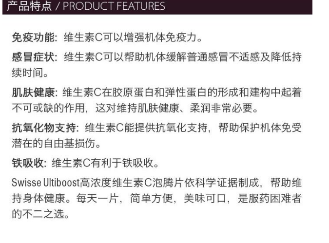 这款Swisse维C泡腾片60片/盒*2盒,【品牌直采】【每日一片,溶于水中服用,60天量】维生素C在胶原蛋白和弹性蛋白的形成和结构方面发挥重要作用,有助保持柔滑皮肤,维生素C具有去自由基作用,有助防止自由基损伤,还可以促进铁吸收,并有助缩短感冒持续时间。