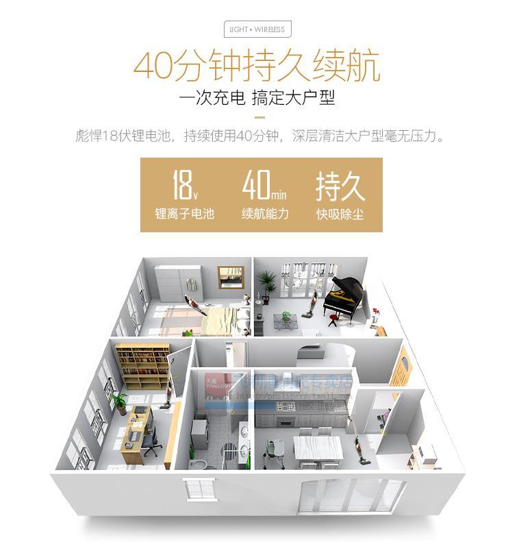 40分钟持久续航,可水洗过滤网,无线手持,摆脱有线束缚。强力锂电池续航持久,飓风离尘技,甩开微尘杂质,磁吸技术,吸尘湿拖随心切换!