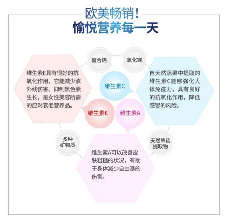 生素C是一种水溶性维生素,容易从人体内流失。一旦人体的维生素C营养不足,就会导致免疫力下降体质变弱动不动就感冒生病,而人体不能制造维生素C,因此必须每天补充。易加能 甜橙维生素C泡腾片 ,每片富含100mg维生素C,有汽水般的口感,是人人喜欢的甜橙味道,同时维C还具有美白抗氧化的作用。