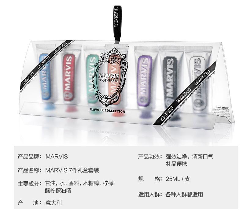 Marvis 玛尔斯 薄荷牙膏 组合套装 25ml*7,目前天猫商城144元,使用20元优惠券,实付124元包邮,意大利进口,赠49元漱口水30ml!