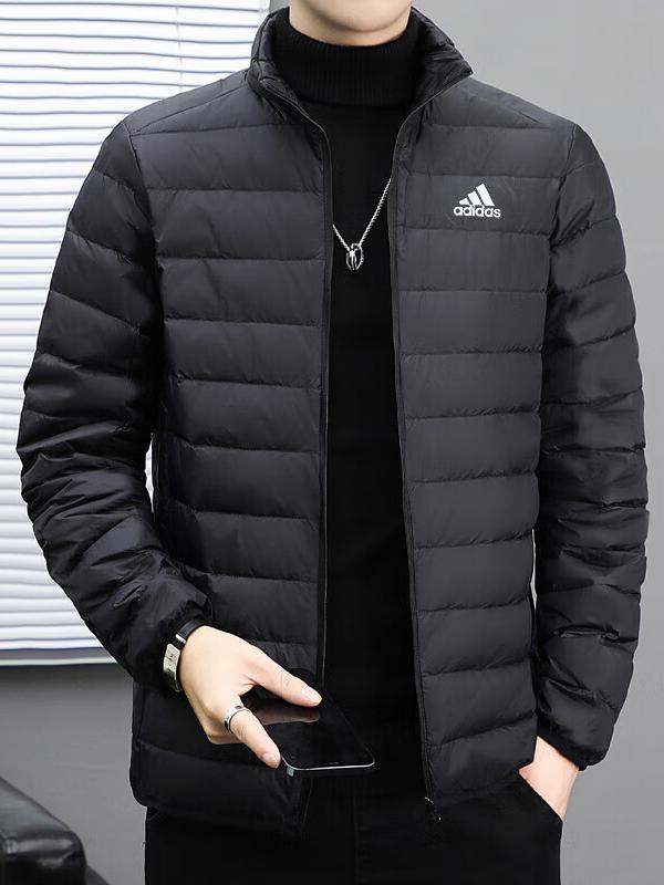 adidas ESSENTIALS LITE DOWN三条纹修身弹力轻薄款加厚防寒保暖内搭全拉链立领套头防风内胆梭织600蓬鸭绒排骨羽绒服 JN4342 黑