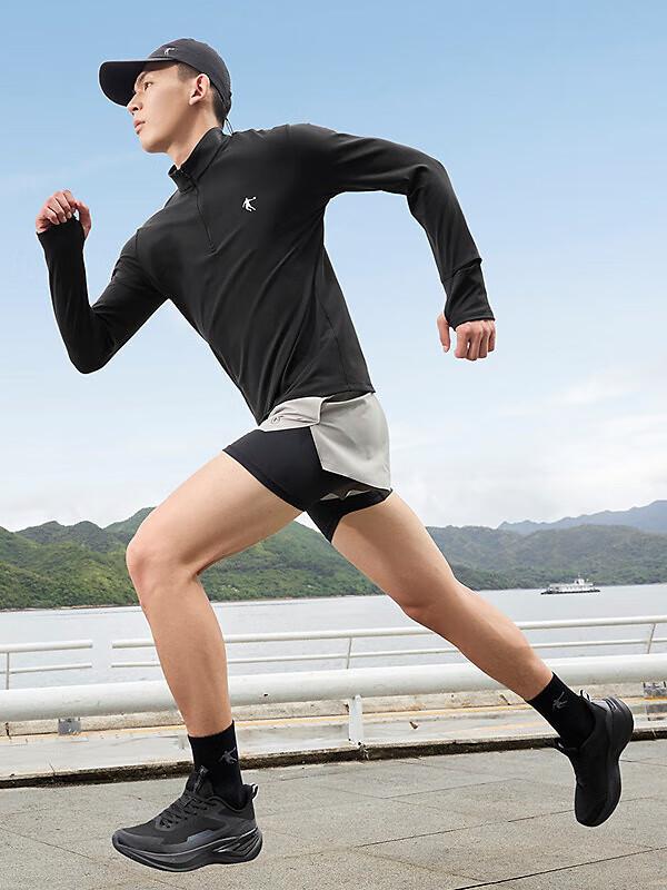 中国乔丹 T恤 飞影系列绒面纯色后背文字印花防风透气吸湿速干排汗马拉松田径加绒加厚立领长袖T恤 XTL33241229R 黑