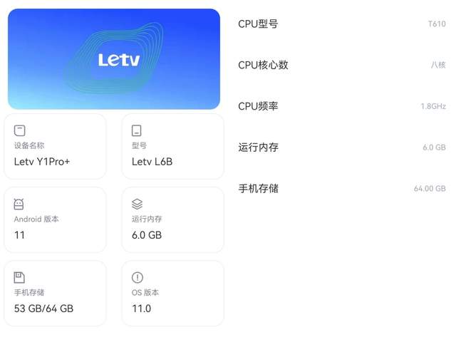 作为远离了市场很多年的手机品牌,手机代工方用的比较稳妥的方法,从配置上采用的是紫光展锐虎贲 T610 八核芯片,6+64G内存只需要499元,这个价格作为备用机还是很不错。乐视Y1 Pro+配备了一块6.5英寸的720P刘海屏,分辨率为1560×720,60Hz刷新率,不支持高刷新率、高采样率和高色域。