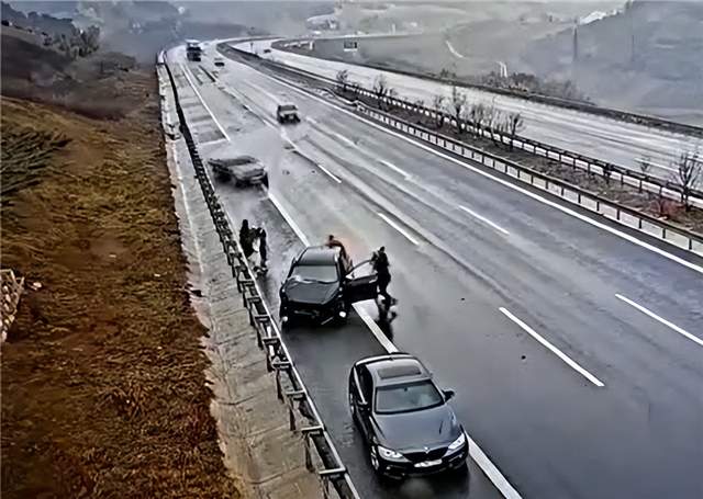 监控画面显示,两台轿车停留在应急车道上,后方车辆车都有损坏,疑似发生了追尾,而从当时的环境观察,此时应该是刚下过雨,路面上湿漉漉的。