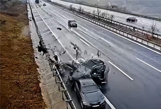 事故非常惨烈,最先接触到的两人被瞬间撞飞,直接翻滚着飞出了数米高,其中一人被甩到了高速路外,另一人则飞出了监控画面,而其他三人也未能幸免,纷纷被撞到在地,停放的车子也被撞的四零八落,几近报废。