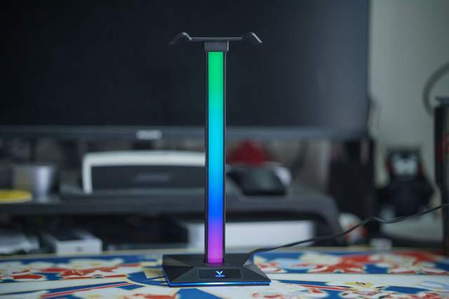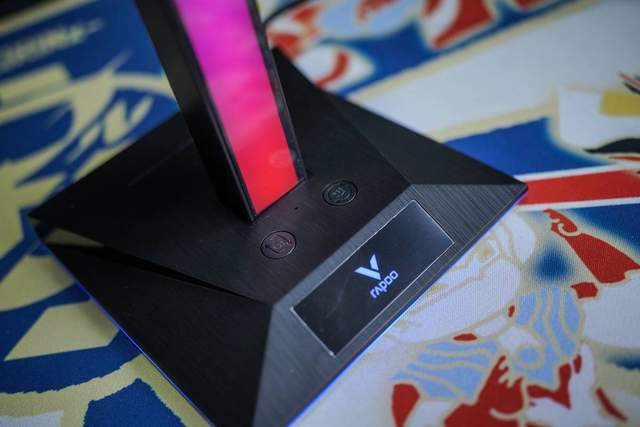 VH10RGB支架同样采用了RGB灯效的设计,只不过这条灯带是一个拾音灯,它可以根据周围声音的律动,展示出10种灯光效果,底座上的logo处以及最下面的一段同样支持调节,有17种效果可以选择。拾音灯和底部灯带效果的切换按钮都放在了底座上。