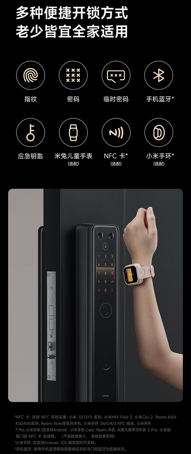 其他方面,这款门锁还采用了创新防夹手设计、全自动降噪锁体,支持自动落锁,配备感应式电子门铃,提供多种开锁方式,还支持十余种安全技术。