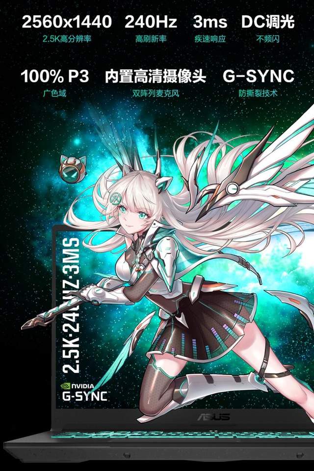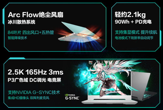 内置的冰川散热架构,由双84叶片Arc Flow绝尘风扇+四出风口+五热管组成,支持智能降噪技术。采用15.6英寸2.5K 165Hz电竞屏,拥有3ms疾速响应、G-SYNC防撕裂技术、100% DCI-P3色域覆盖等特性,可助玩家把控战场中的每一丝细节。
