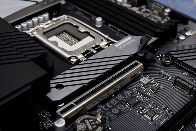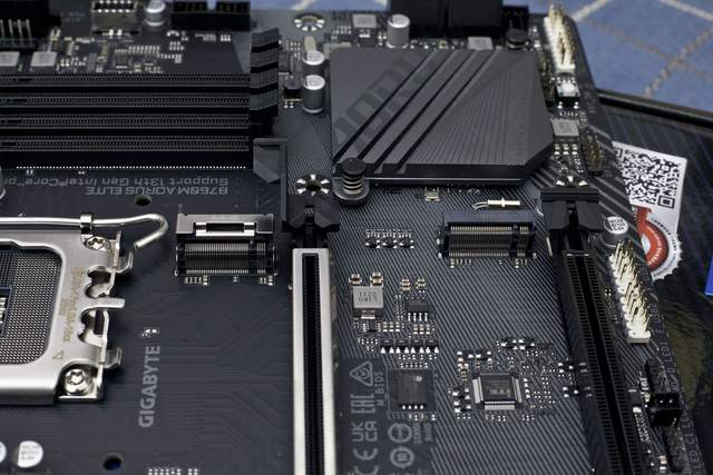仔细观察的话,可以看到技嘉小雕B760M AORUS ELITE的第二个M.2插槽上带有EZ-Latch的免工具安装设计,无论是装机亦或是升级扩展M.2硬盘都可以更加方便。