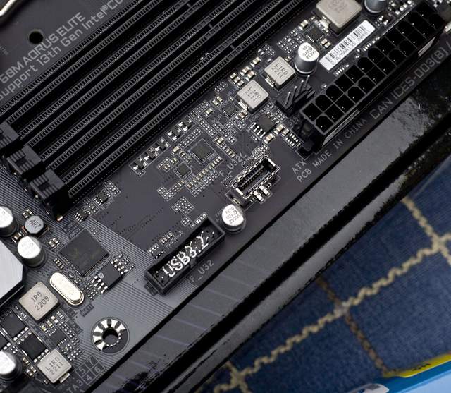 在前置的USB扩展接口方面,技嘉小雕B760M AORUS ELITE除了有常见的19针USB 3.2接口之外,它还额外配备了1个Type-C USB3.2 Gen 2的接口,最大传输带宽可达20Gbps。