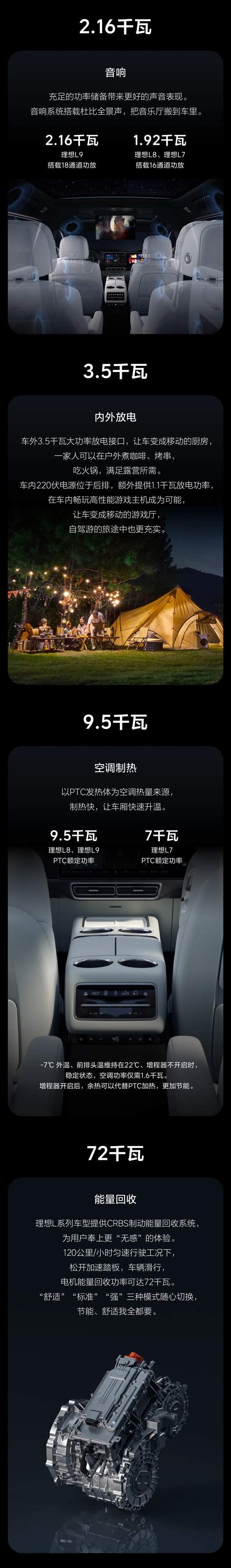 音响功率最高2.16千瓦,车外放电3.5千瓦,空调制热9.5千瓦。