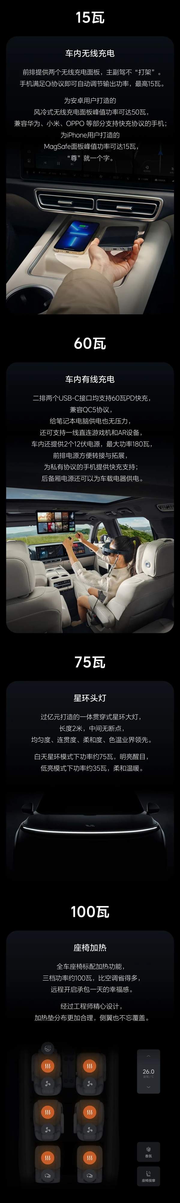 HUD抬头显示功率13瓦,车内无线充电15瓦,车内有线充电60瓦,星环头灯75瓦。