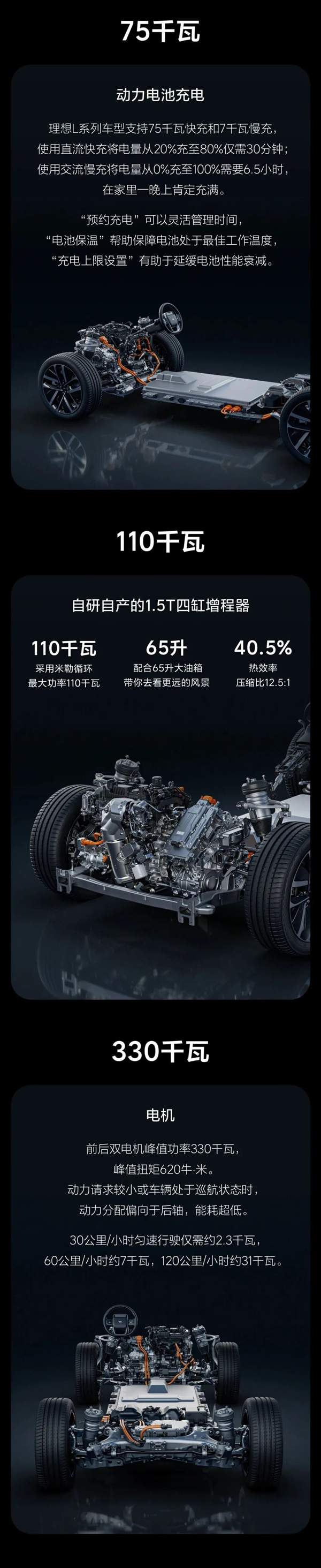 增程器110千瓦,电机330千瓦,动力电池充电75千瓦,而电机能量回收功率竟然可达72千瓦……
