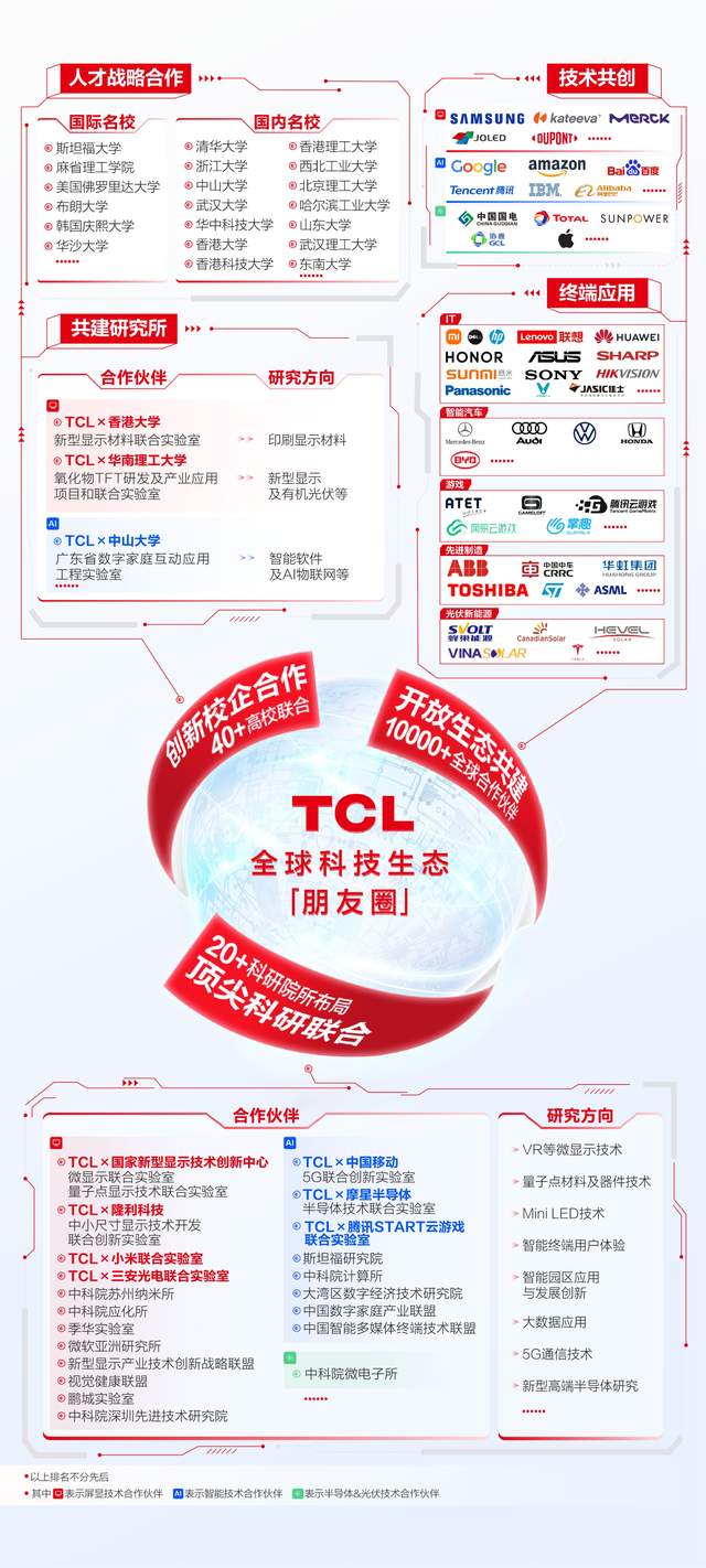 自身硬气,TCL的生态布局朋友圈就四面八方全都有人了,朋友圈里全是大神。现在名单上能看到他们联合了40多所高校进行创新校企合作,全都是理工科TOP,清华、浙大、哈工大、斯坦福、麻省理工等等统统收入囊中,还跟港大、中大、华工都共建了研究所,打通了产学研的深度合作;还与20+研究院所布局顶尖科研强强联合,不管是国家级还是世界级的研究院所,都是它的“圈”中密友。
