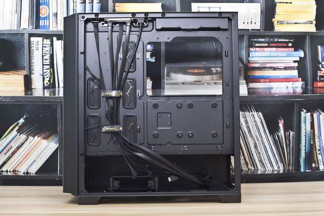 再来看背部方面,隐藏式电源仓设计也是现在的基本操作了,可以把线材藏起,让机箱内部更为干净简洁。开孔位置也十分充足,还配备了走线扎带,方便了有走线需求的用户。