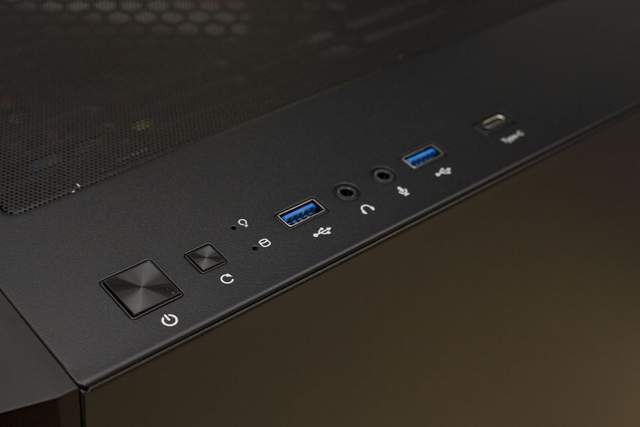 接口方面,电源按钮、RESET键,2个USB 3.1接口,麦克风和耳机接口。同时还加入了Type-C口,前置C口的设计大大方便了用户连接智能手机和移动硬盘等数码产品,毕竟现在C口已经成为数码产品的主流了,而现在中高端机箱才会带有Type-C口,期待日后能成为主流。