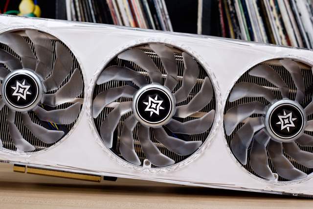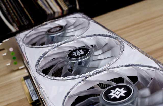 为什么盒子那么大,毕竟影驰RTX 4080 16G星曜OC的整体尺寸达到了338×139×69。为什么要配备支架,因为它的确“分量”十足,可见其做工的厚实。散热器方面,影驰RTX 4080 16G星曜OC采用的是星卓III散热系统,3风扇设计,每个风扇拥有11篇静霜扇叶。值得一提的是,风扇四周还采用了大量钻石切割设计,看起来十分精致。