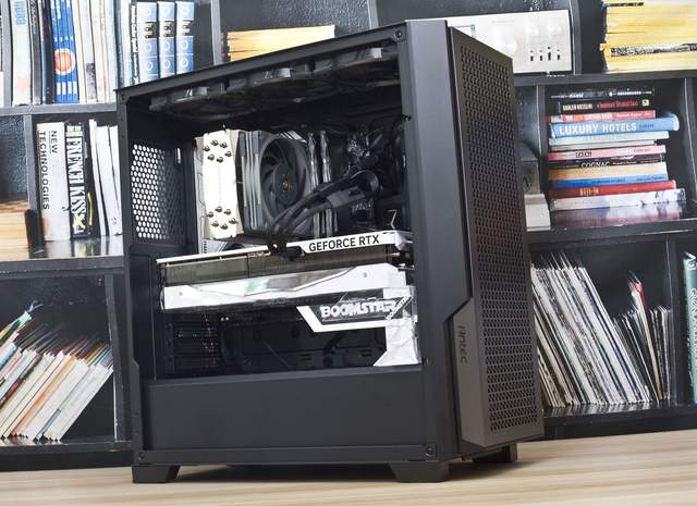 安装过程就不详说了,整体入箱后,安钛克P20C内部的位置还是比较充裕的,影驰RTX 4080 16G星曜OC入箱位置也刚刚好,所以对于40系显卡来说,机箱还是要选择中塔比较合适。
