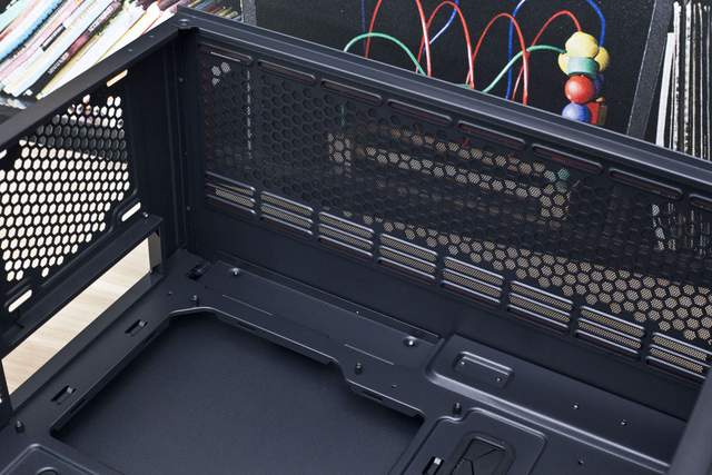 安钛克P20C的风扇位置还是比较充足的,绝对能满足喜欢玩光污染效果的朋友需求。前面板支持120mm*3/140mm*3风扇,最高支持360mm水冷;顶部支持120mm*3/140mm*2风扇,最高支持360mm水冷;尾部支持120mm水冷和风扇;还值得一提的是,电源仓上方同样也支持120mm*2风扇,来辅助显卡散热。支持双位360水冷,可玩性可以说十分高。