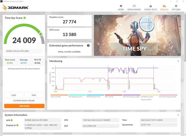 在3DMark的Time Spy测试中,影驰RTX 4080 16GB 星曜 OC显卡取得了24009的总成绩,其中显卡分数为27774。