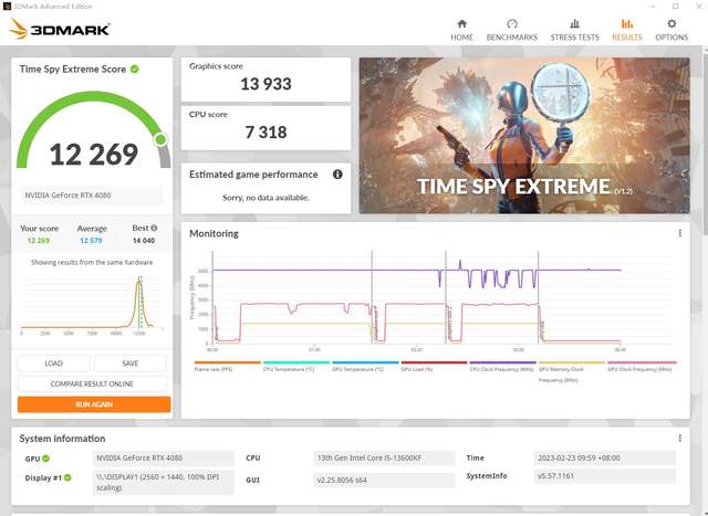 3Dmark的TSE模式测试,DX12下的4K分辨率测试,显卡测试分数为13933,CPU得分为7318,整体成绩为12269。