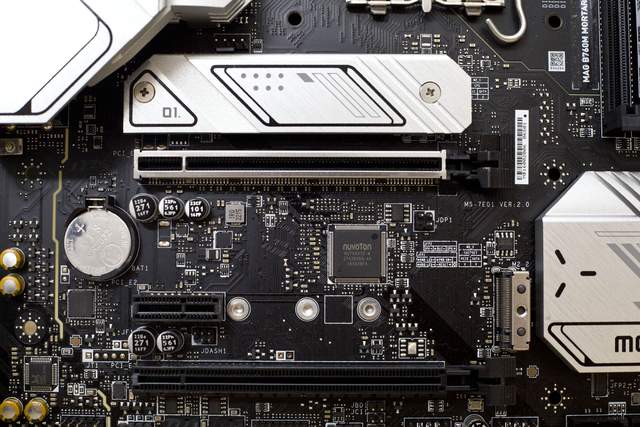 微星 MAG B760M MORTAR WIFI DDR4迫击炮的两个M.2接口均为标准的2280孔位,其中第一条M.2接口配有散热马甲,安装螺丝都带便捷卡扣。第一个M.2接口是由CPU直出,而第二个接口则是由PCH提供,两者的速率均为PCIe 4.0 x4。