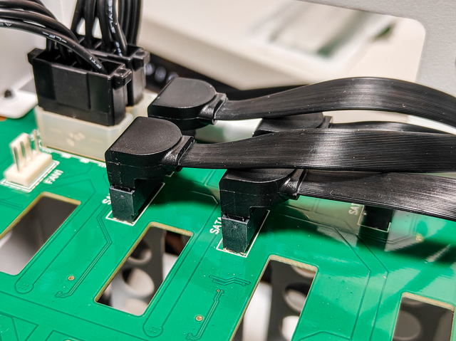 另外特别提醒打算入手乔思伯N2的朋友,这台机箱的硬盘转接卡需要接主板的SATA数据口,并且位置和背部出风风扇贴着,只能使用L型弯头的SATA数据线,直头线盖不上盖子,我单独后买了四根绿联弯头线才能安装回去,虽然价格不贵但是耽误事情,切记切记。