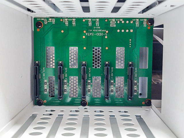 乔思伯N2机箱本身带五个3.5寸硬盘位,比较有趣的是这张硬盘拓展卡接口兼容SAS硬盘,市面上有大量便宜的3-4T容量拆机SAS机械硬盘,后期维护成本会很低。