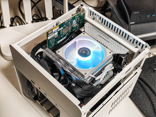乔思伯N2背部预留了8cm挡板的PCI拓展槽,可以用于插半高显卡(刀卡)、U.2固态或者和我一样的万兆显卡,占地面积和原来的NAS差不多,适合组建核显钢炮或者NAS设备。