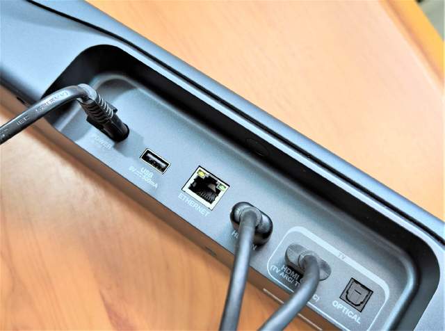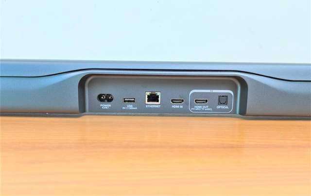 条形音箱背面拥有多接口的设计,其中包括电源输入、USB、HDMI IN和HDMI OUT、网线输入等接口,迎合不同外接设备的接驳需求。