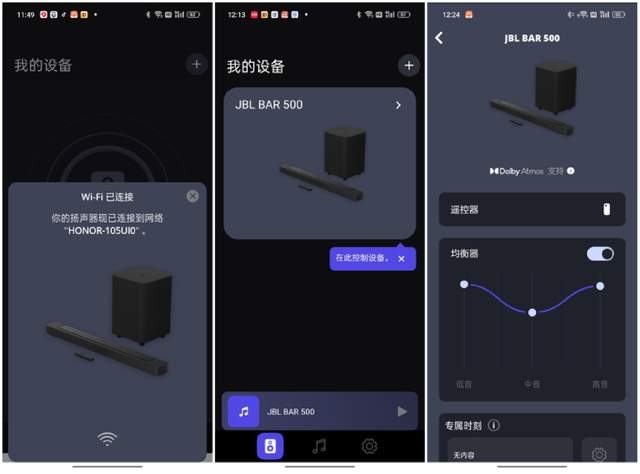 以前的音箱装置在连接时太费力了,但是JBL Bar500回音壁音箱一改传统,内置WiFi连接,透过蓝牙和智能设备连接,畅享自动化且无损的连接方式。我们可在手机下载“JBL ONE APP”,按照提示配置音箱WiFi使用,躺平在沙发上调节均衡器,随心设置专属自己的音效,给你便捷的科技体验。